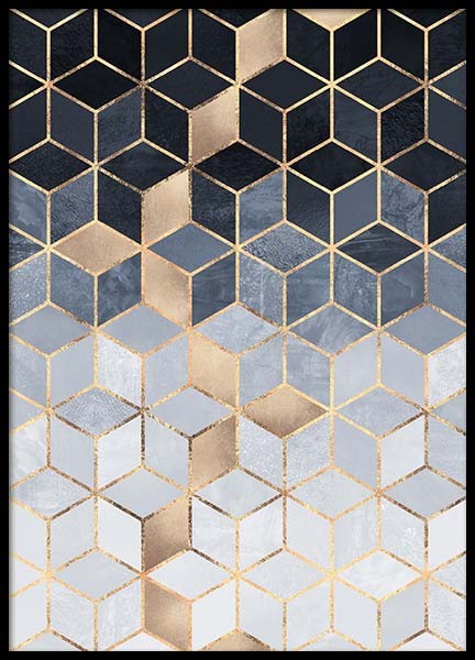 Elisabeth Fredriksson, „Daydream Cubes“ Grafikposter mit Motiv in Grau mit goldfarbenen Komponenten