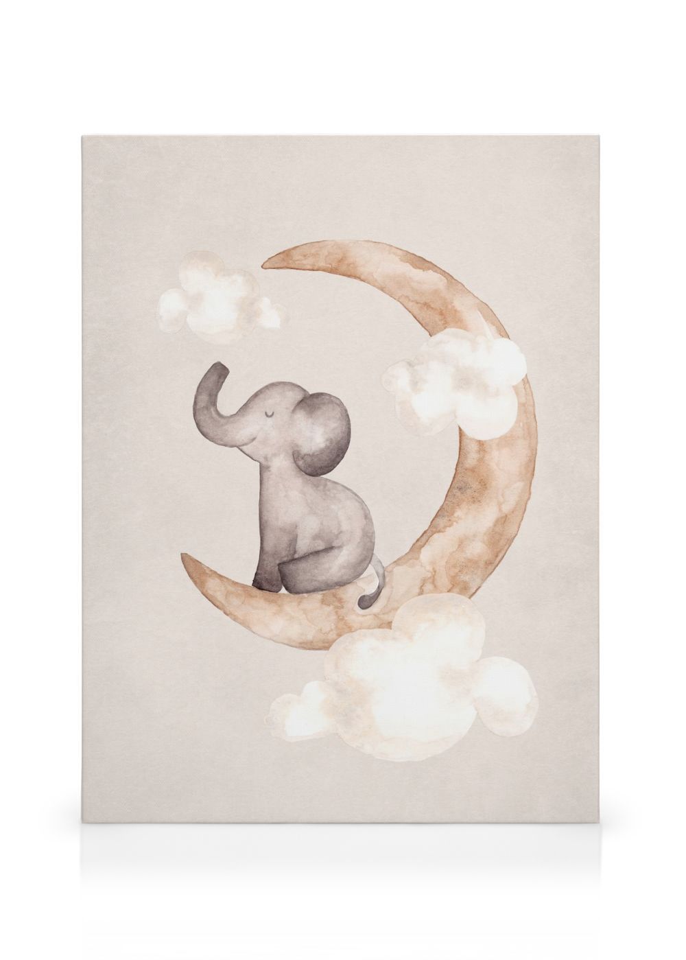 Aquarell-Malerei eines Elefantenbabys, das vor einem beigen Hintergrund von Wolken umgeben auf einem beigen Mond sitzt. Diese wunderschöne Illustration ist perfekt für ein Kinderzimmer, noch schöner wird sie in Kombination mit Dreaming Whale!