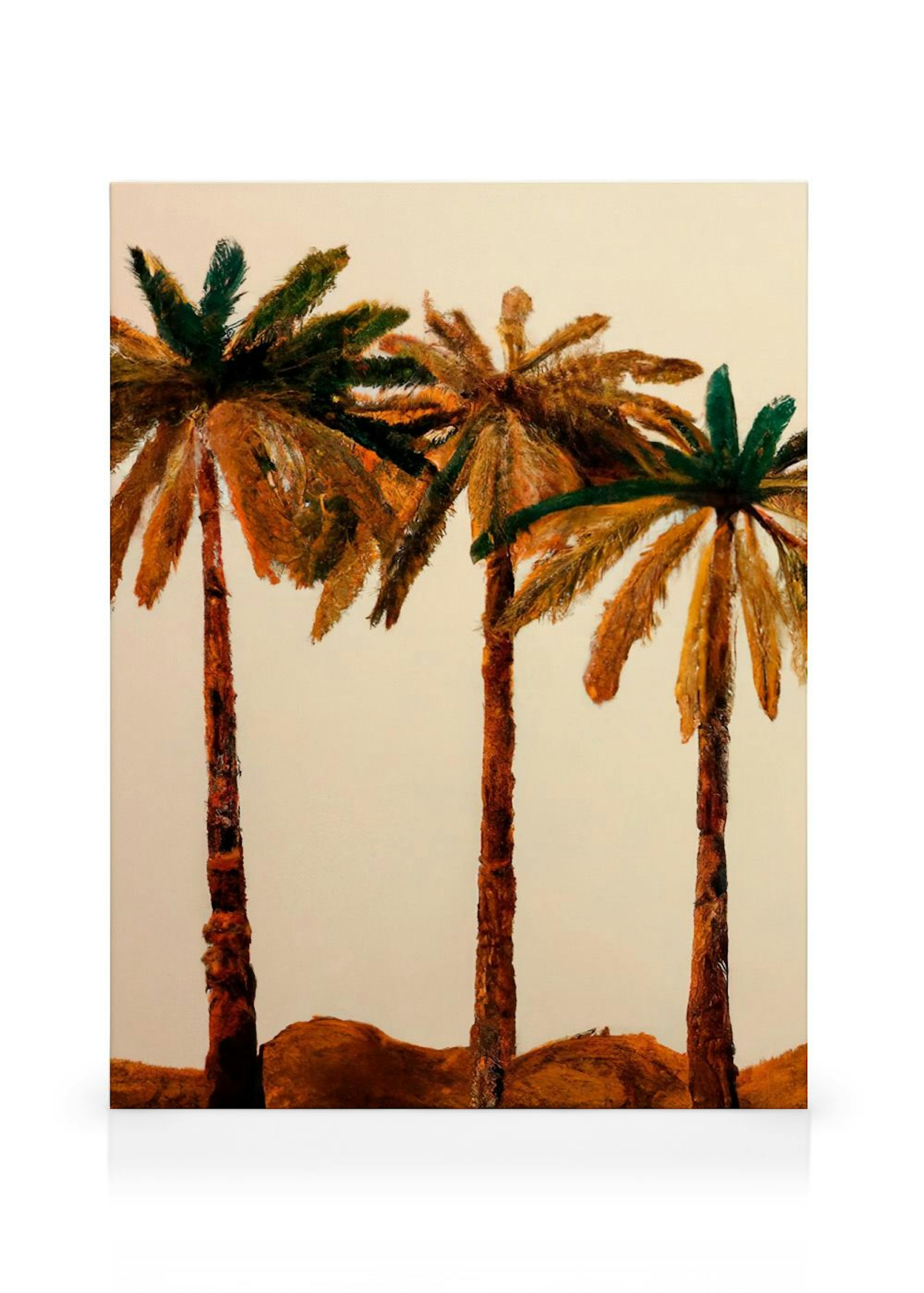 Ein Leinwandbild von drei Palmen auf sandigem Boden. Die braunen Stämme tragen grüne und braune Blätter. Der helle Beige-Hintergrund verleiht dem Motiv eine warme Ausstrahlung.