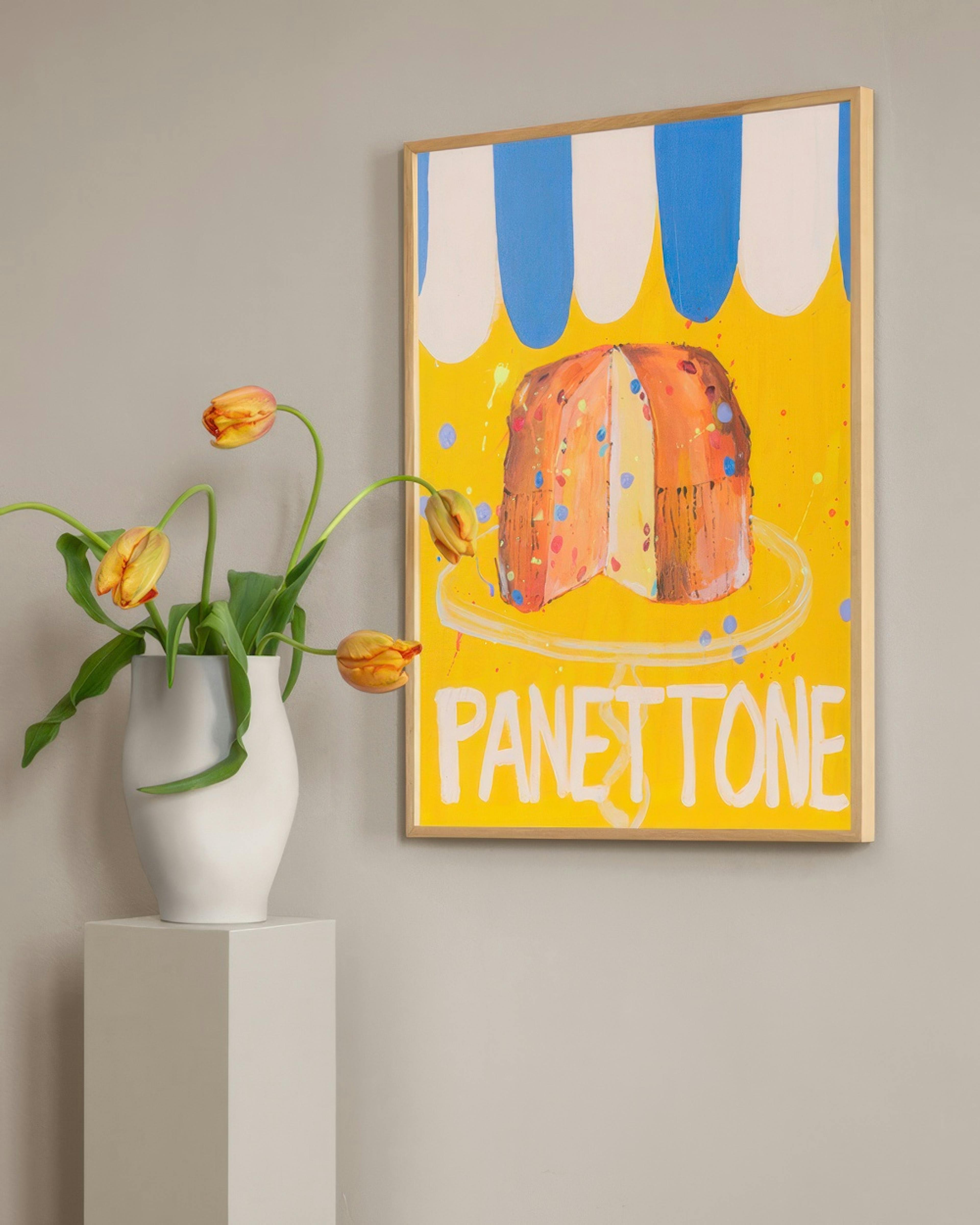 Ein verspieltes Motiv eines Panettone. Die lebhaften Farben in Gelb, Blau und Weiß machen dieses Poster zu einer vergnüglichen Ergänzung für deine Küche.