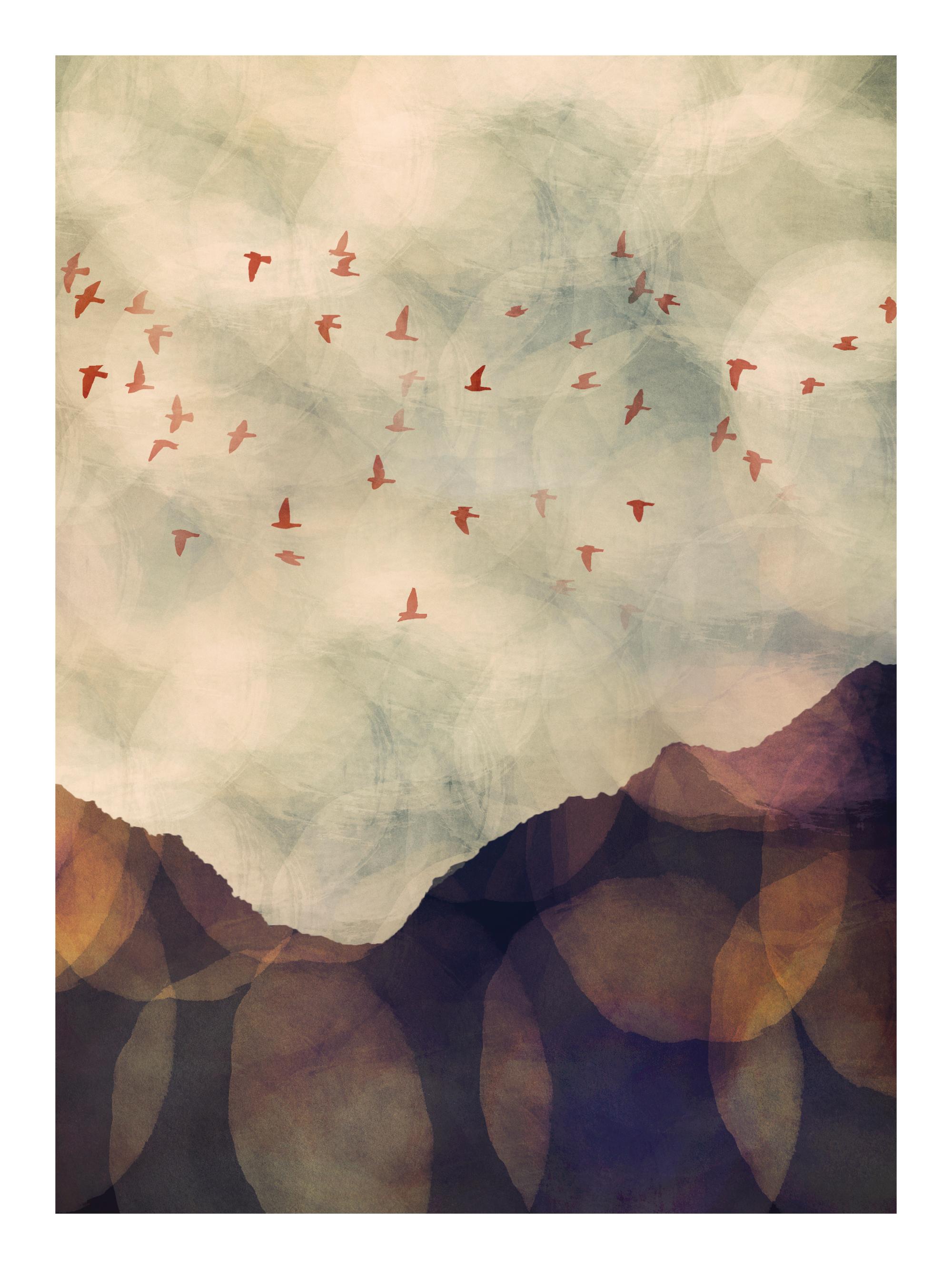 Illustration von Vögeln, die über einen Berg mit einem bewölkten blauen Himmel im Hintergrund fliegen. Modernes Poster mit einem schönen und entspannenden Motiv.