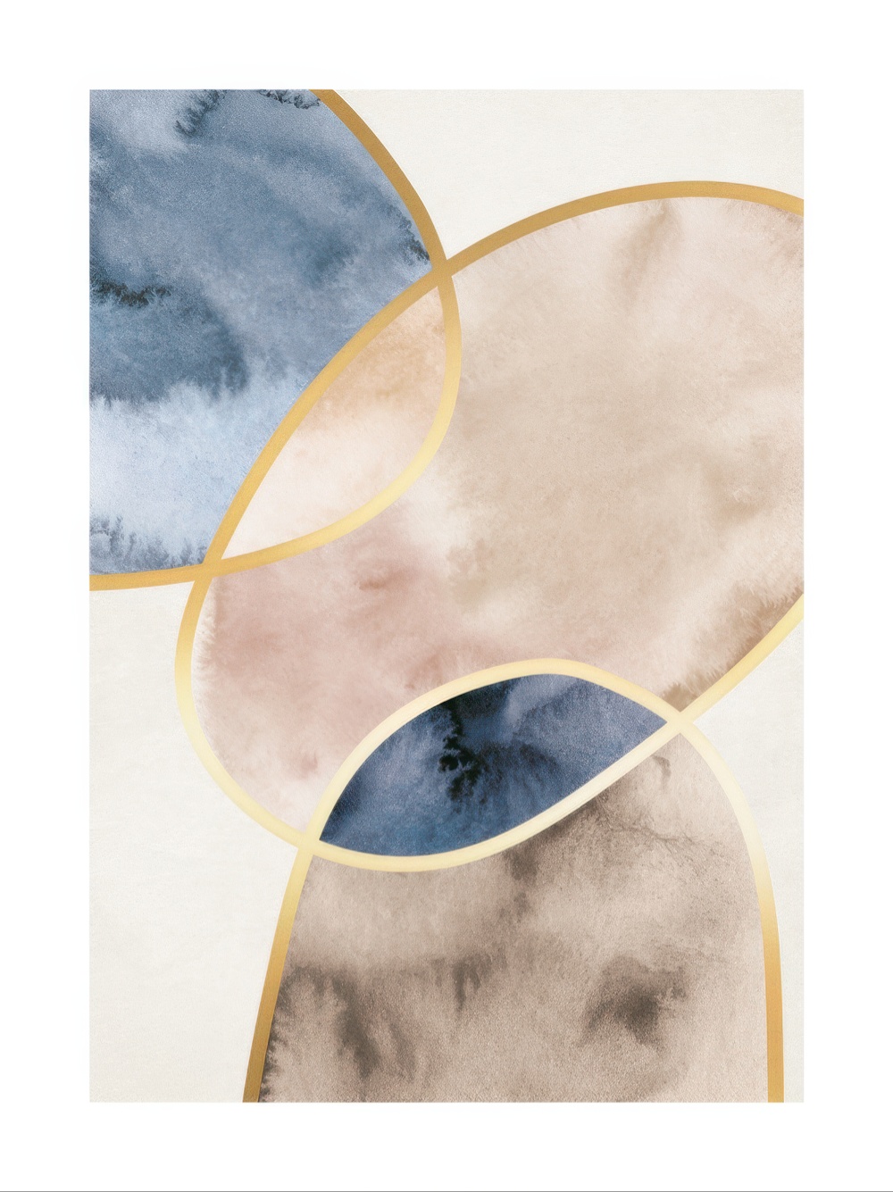 Ab 6,58 €Aquarell mit abstrakten Formen in Beige und Blau mit goldenen Umrissen auf einem hellgrauen Hintergrund